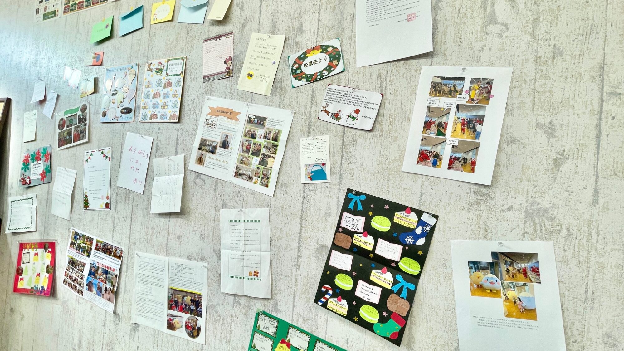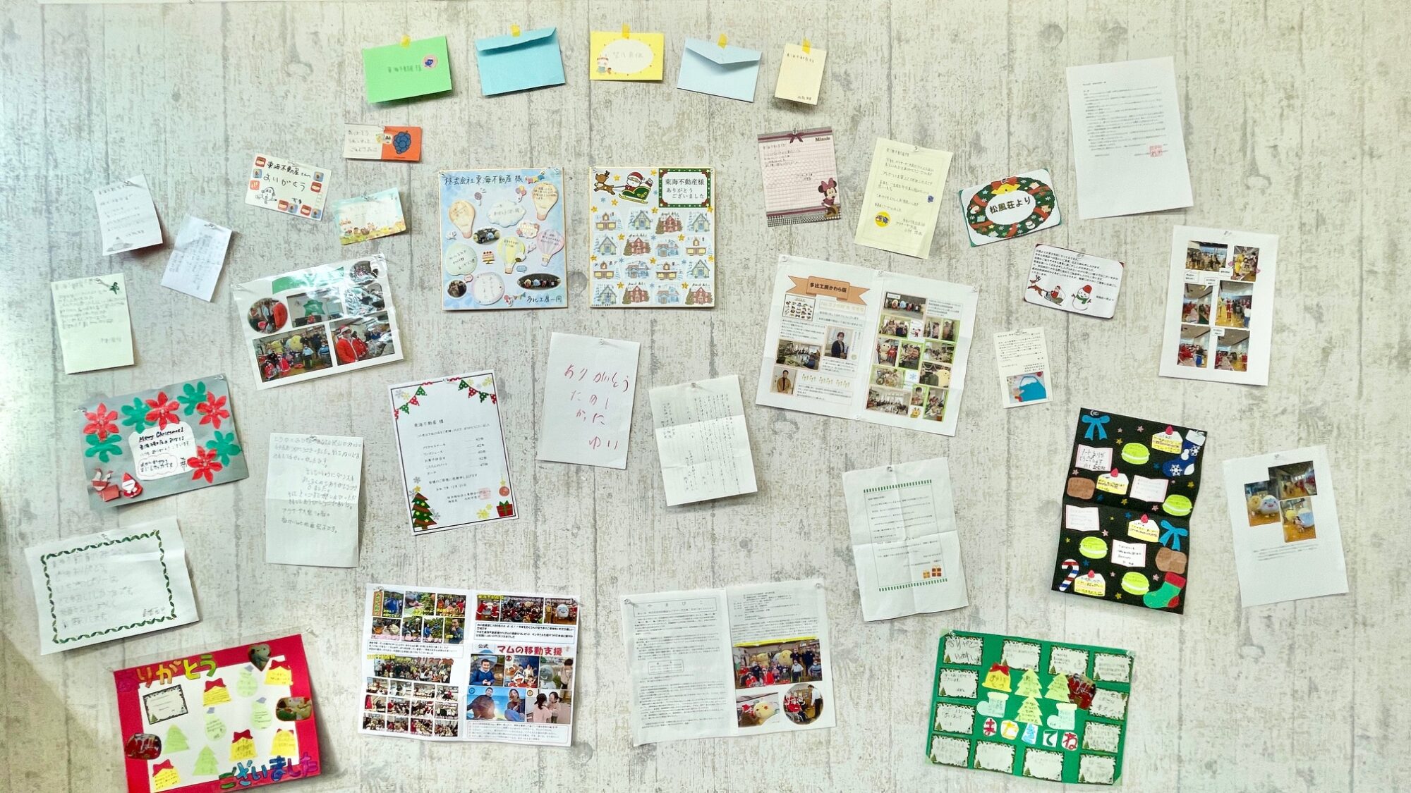 いただいたお手紙等は、毎年、弊社事務所にこのような形で飾らせていただいております。