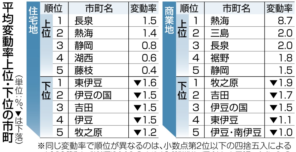 御殿場市の住宅地は0・3%、商業地は0・7%の伸び。住宅地と商業地ともに、利便性が高く供給数が少ない「花みずき通り」沿いが高騰している。住宅はJR御殿場駅近くで12万円前後の高値の取引がある。小山町の住宅地は0・3%の下落。人気の北郷地区では5万円前後の売買があるが、JR足柄駅周辺などは下落傾向が続いている。